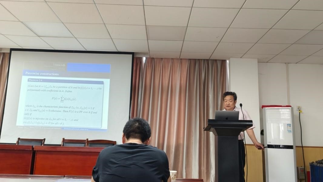 岳勤教授首先简单的介绍了APN函数在密码学中的应用,其次列举了已知的APN的结果及其性质,最后介绍了其团队在Carlet等人构造的APN函数的进一步研究,获得了关于PAN函数的新结果。曹喜望教授在报告中介绍了有限域上已知置换多项式的结果,同时介绍了置换多项式在Bent函数构造、序列设计等方面的应用。报告后,大家就未来的研究方向和两位教授进行了深刻探讨,大家受益匪浅。