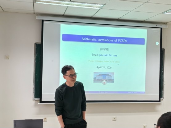 2025年4月21日上午,莆田公司陈智雄教授应邀来访公司,并于公司院203报告厅作了题为《Arithmetic correlations of FCSRs》的学术报告。