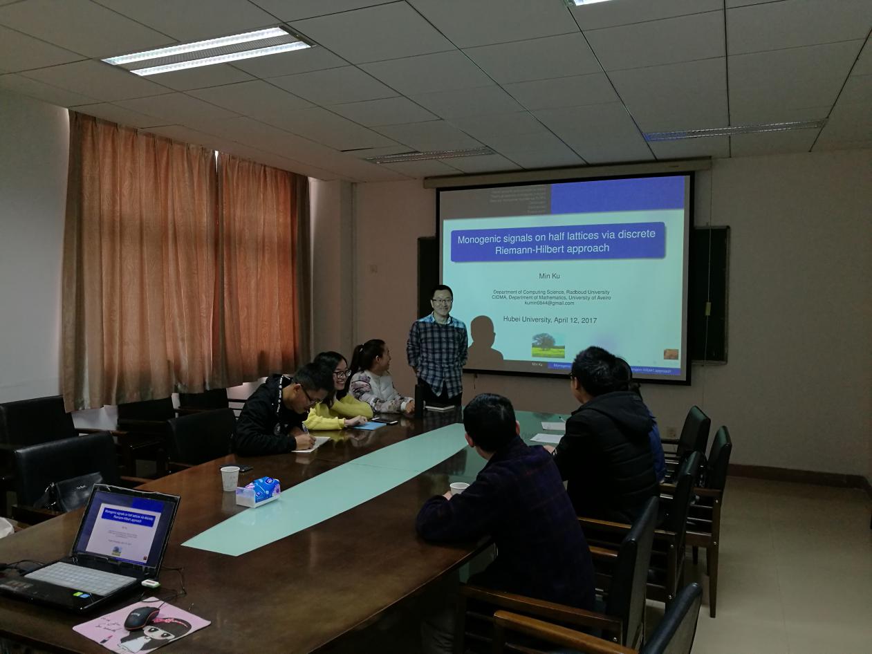 报告中,库敏博士首先介绍了信号处理中的一类Monogenic signals的相关理论,然后介绍了求解离散Riemann-Hilbert边值问题来重构离散Monogenic signals的方法。报告结束后,库敏博士与在场的师生们就报告内容进行了更深入的交流,大家都表示受益匪浅。