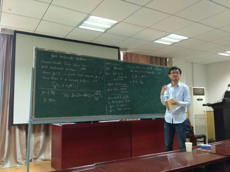 报告中,陈世炳博士从基本的Minkowski问题出发,阐述了经典的Minkowski问题,并依托这一个问题,深入浅出的介绍了在凸分析中的基本概念,并结合图像解释了这些概念的几何意义。在阐述这个问题时,陈博士依托高斯映射,定义了Dual Curvature Measure这样的一个测度,并在一个具体的例子中直观的阐述了它的几何意义。有了这样的一个概念,陈博士就介绍了自己做的工作,一个在低维情况下Dual Minkowski problem的解的存在性的问题。在报告的最后回答了师生的问题,并和公司师生进行了更为深入的交流,师生们感到受益匪浅。
