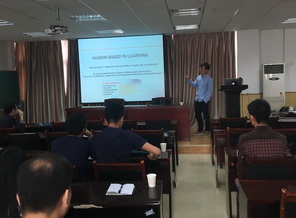 4月27日上午,西安交通大学龚铁梁博士应邀来公司讲学,在院201报告厅为公司师生做了题为“Margin based PU Learning”的学术报告,报告由公司的邹斌教授主持。来自应用统计、应用数学、计算数学等相关专业的教师、博士和硕士研究生参加了本次学术报告。