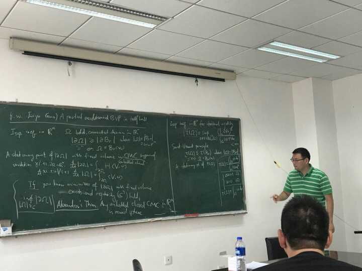 夏超教授为师生作了题为《A partial overdetermined problem in a half ball的》学术报告。报告中,主要讲解了半球中Serrin型的部分超定混合边值问题。