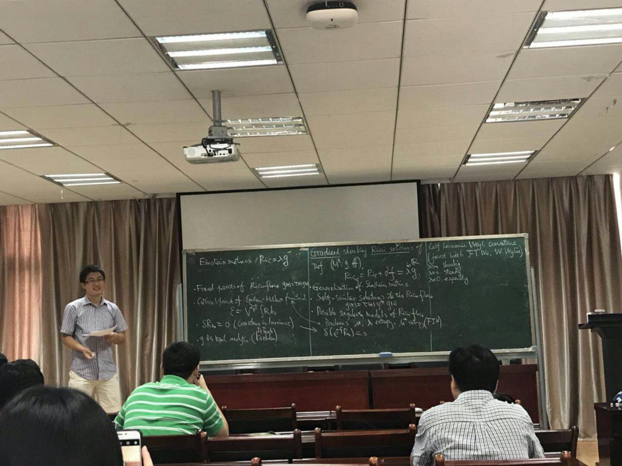 吴鹏教授为师生作了题为《Gradient shrinking Ricci solitons of half harmonicWeyl curvature》的学术报告。主要讨论了the classification of radient shrinking Ricci solitons with half harmonic Weyl curvature。