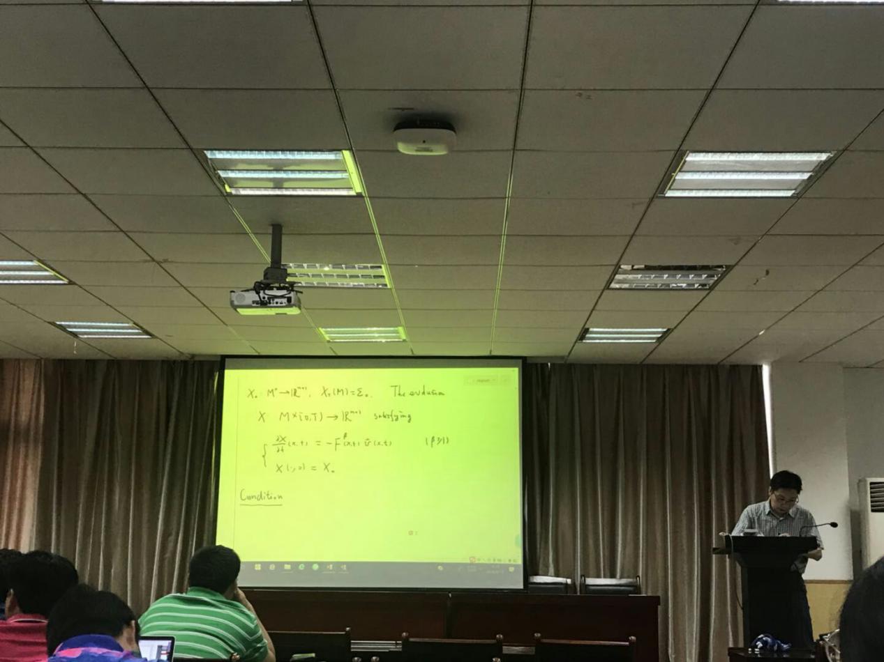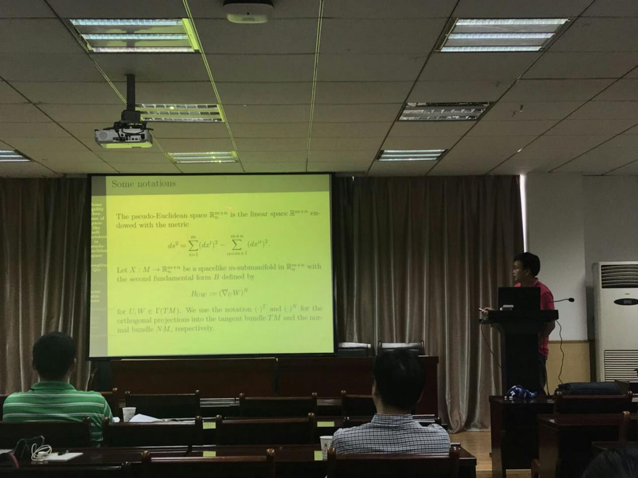 邱红兵教授为师生作了题为《Some rigidity theorems of spacelike self-shrinkers in pseudo-Euclidean spaces》的学术报告。报告中给出了在不同条件下的几个rigidity定理。