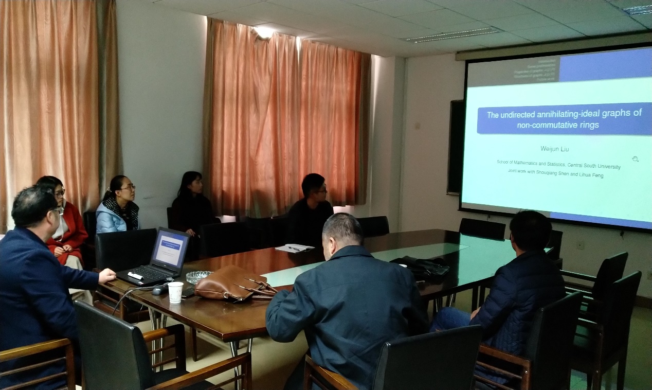 刘教授做了题为“The undirected annihilating-ideal graphs of non-commutative rings”的报告,首先给出了零因子图的相关概念,考虑其连通性、直径、度数等,然后分别在交换环和非交换环中讨论,最后考虑特殊环的零化理想图的相关性质和结构,反过来满足这些性质的环的性质结构如何。