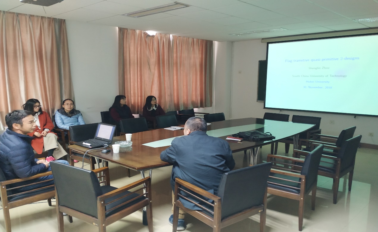 周教授做了题为“Flag-transitive quasi-primitive 2-designs”的报告,首先介绍了2-设计的定义和一些基本事实,以及其自同构群,然后介绍旗传递2设计,对于不同的参数、对称与非对称的不同情形给出了相应结果,最后是关于拟本原的相关知识的介绍。