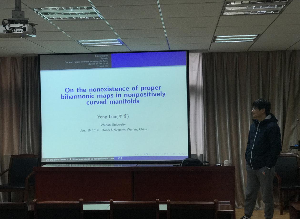 2017年1月15日上午,武汉大学数学与统计公司罗勇教授来公司讲学,在williamhill中文官网201报告厅作了题为On the nonexistence of proper biharmonic maps in nonpositively curved mannifolds的学术报告。听了罗勇教授的讲座,全体师生获益颇多,受益匪浅。