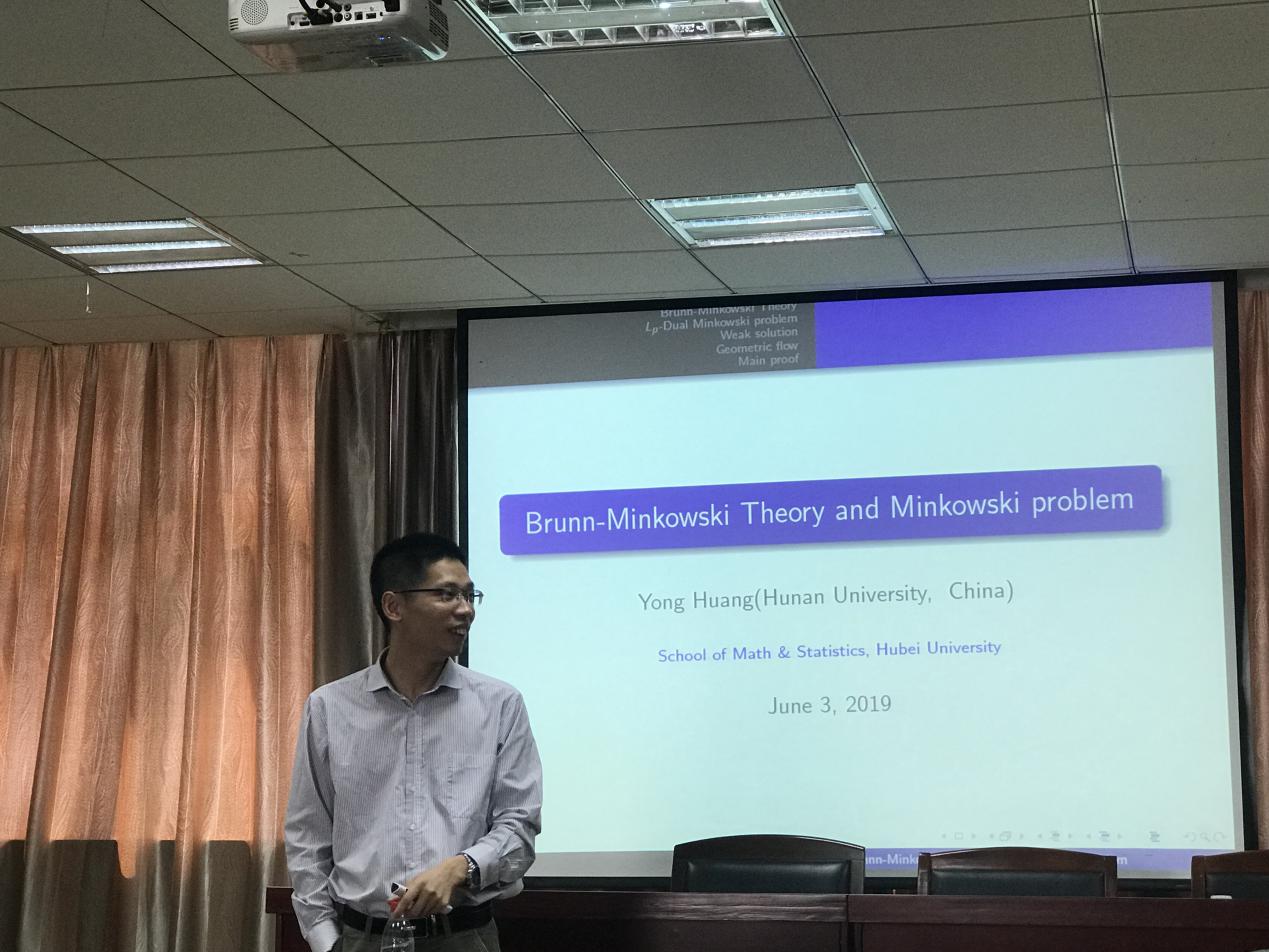 报告中,黄勇教授介绍了与Brunn一Minkowski Theory and Minkowski Problem相关的一些问题,并围绕相关问题与参会师生进行讨论交流。参加报告的师生与黄勇教授讨论了一些相关专业的问题,开拓了自身眼界。