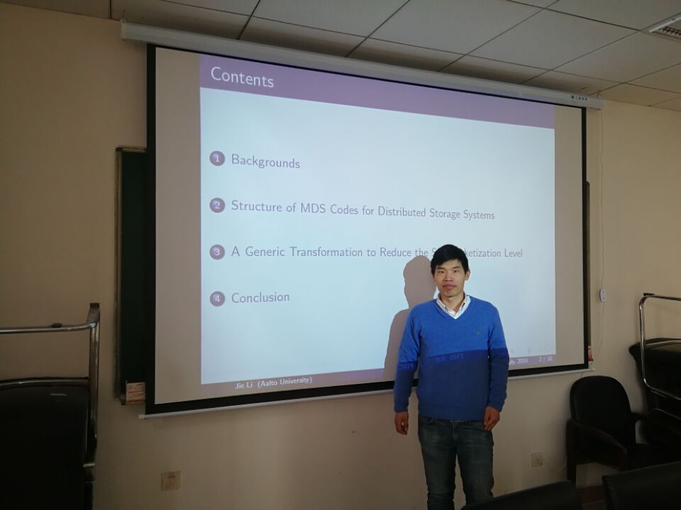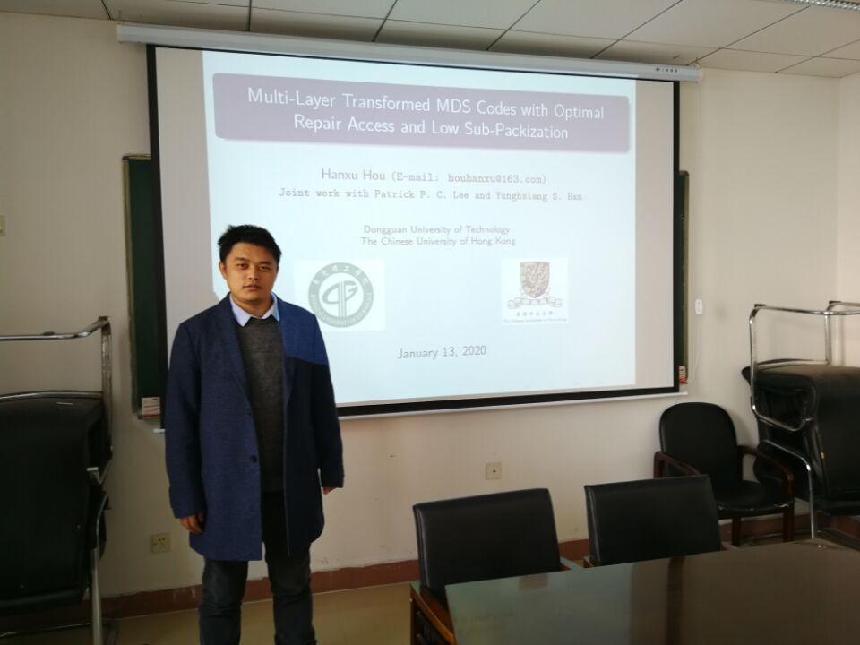 2020年1月13日,网络编码专家侯韩旭和李杰博士应邀来访公司,在院203为相关师生分别做了题为《Multi-Layer Transformed MDS Codes with Optimal Repair Access and Low Sub-Packetization》和《Systematic Construction of MDS Codes with Small Sub-packetization Level and Near Optimal Repair Bandwidth》的学术报告。
