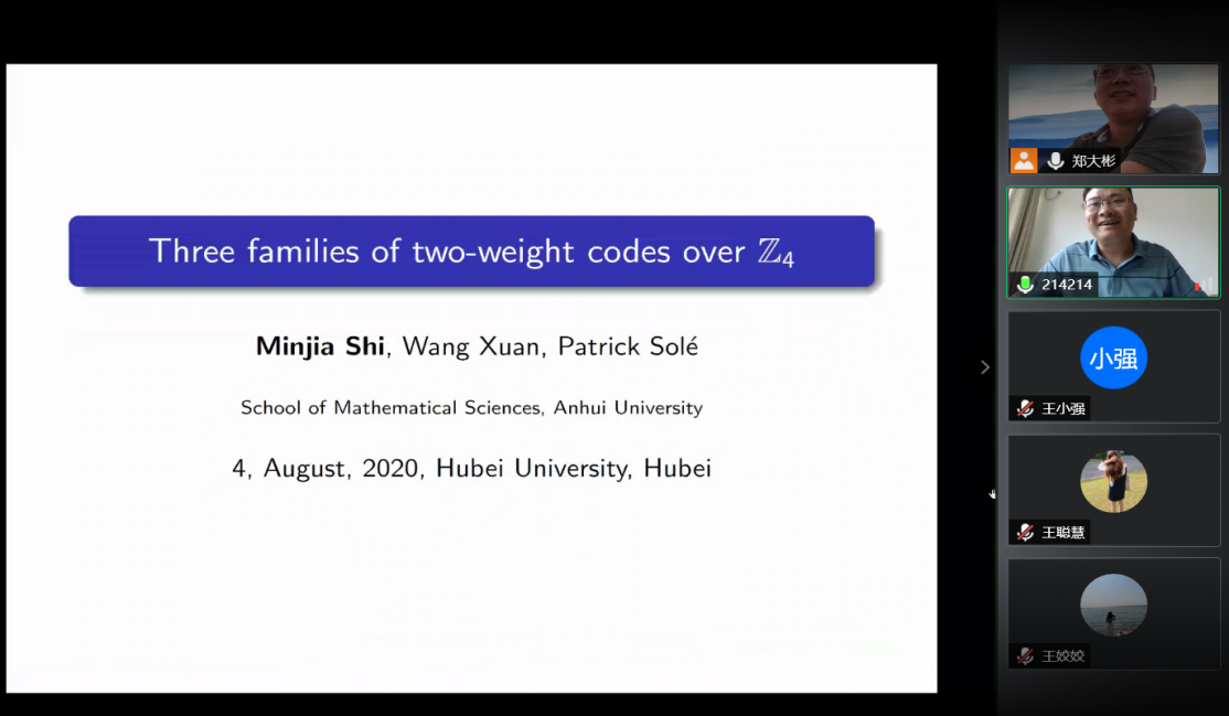 施敏加教授的报告题目为《Three families of two-weight codes over Z4》,本次报告介绍了在环Z4上三类相对于Lee-重量的二重仿射线性码的构造,并给出了这些线性码的重量计数予以及由它们所获得的强正则图。证明了在Gray映射下这三类线性码在有限域上是非线性的充要条件,比较了所获得的非线性码与经典的SU1类型二元非线性码参数之间的差异。