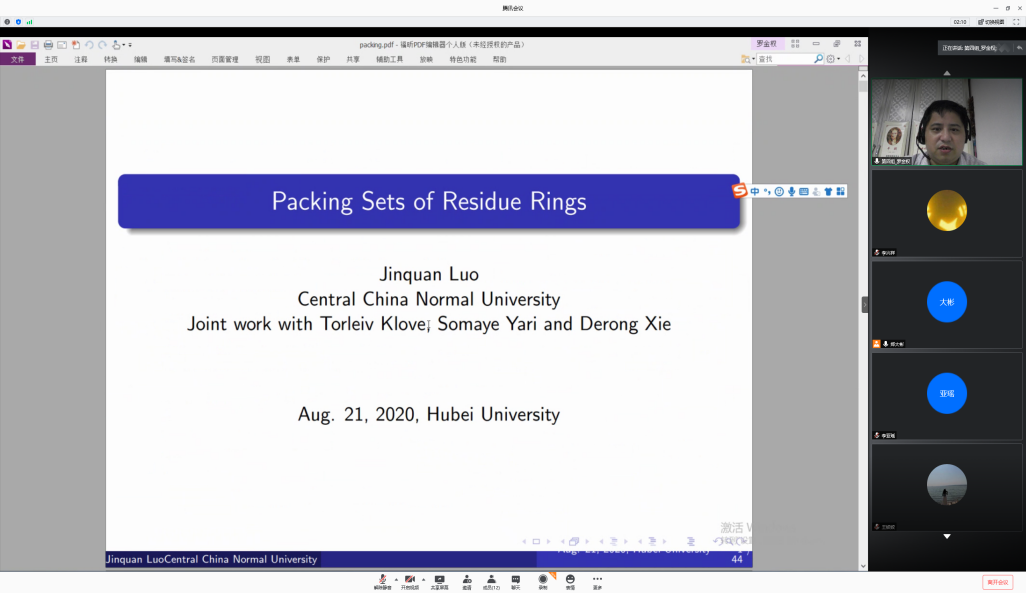 罗金权教授的报告题目为《Packing Sets of Residue Rings》,本次报告介绍了剩余类环上填充集的构造以及这些集合在构造闪存码中的应用,证明了一些特殊剩余类环上完备填充集存在的充要条件,给出了如何由已知完备填充集去构造新的完备填充集的方法,讨论了当完备填充集不存在时,如何寻找几乎完备填充集的一些具体思路。