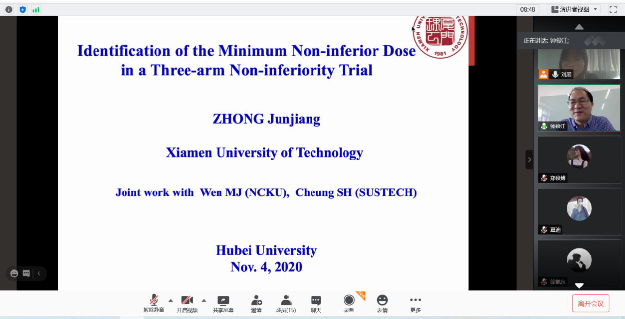 2020年11月4日中午13点,厦门理工公司应用数学系钟俊江教授应公司刘展教授邀请,为公司师生作了一场生动的学术报告。由于疫情原因,本次报告在腾讯会议上举行,由刘展教授主持,来自应用统计专业的教师、硕士研究生等共16人参与了报告的听取和讨论。