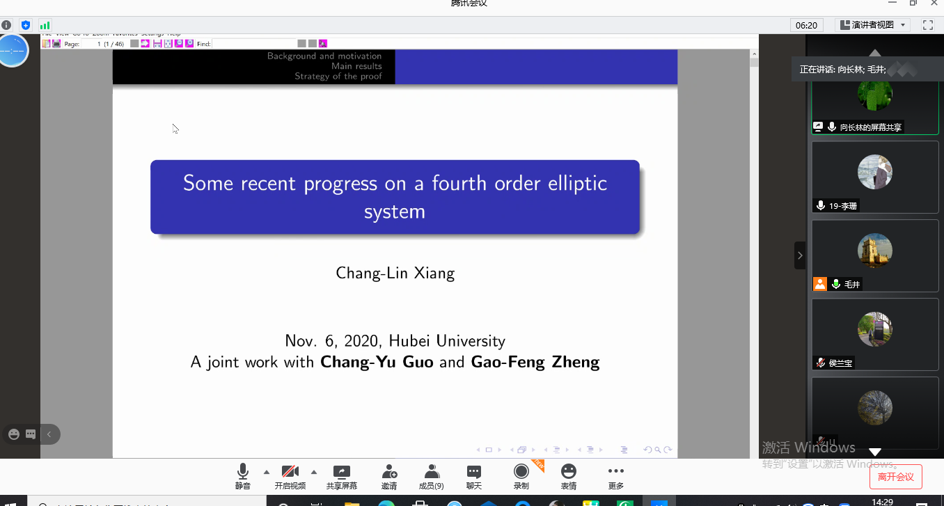 2020年11月6日下午,长江大学向长林教授应邀为公司相关专业的教师与研究生做了题为“Some recent progress on a fourth order elliptic system”的线上学术报告。