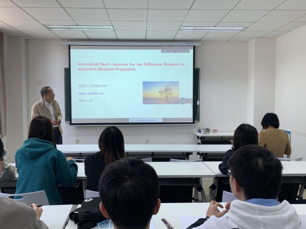 吴延科老师报告题目为《Generalized Beal’s Intervals For the Difference Between Independent Binomial Proportions》,主要针对独立二项比例之差,在Beal方法的基础上,提出了广义的Beal区间,该方法在理论和实践上都能有效地阻止明显的击穿结果。此外,具有最优权值的广义Beal区间比大多数常用的广义Beal区间具有更好的覆盖概率和更短的区间,最重要的是,最优权值具有简单的非迭代形式,与Beal方法相比,增加的计算量较少。最后,通过实验验证了方法的优良性能,并利用一个实际的极端案例分析,来阐明所提方法的性能和实用性。