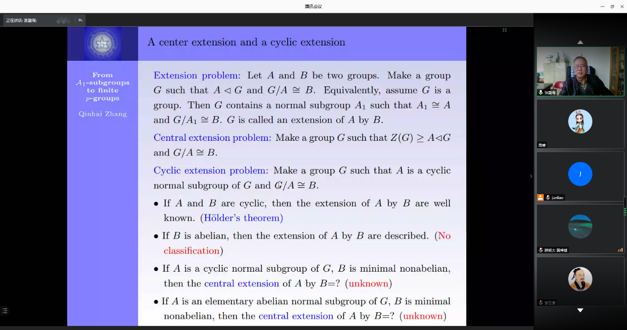 2020年11月14日上午,山西师范大学两位群论专家张勤海教授、安立坚教授应公司廖军副教授邀请,为公司作线上学术报告。会议由刘合国教授主持,来自群论相关专业的教师、博士和硕士研究生参与了报告的听取、讨论。