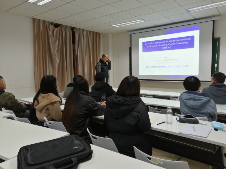 曹原老师作了题为《An explicit expression for all distinct self-dual cyclic codes of length $p^k$ over Galois ring ${\rm GR}(p^2,m)$》的报告,主要介绍了伽罗瓦环GR(P2,m)上码长为Pk的自对偶循环码的构造和计数问题。曹原老师首先介绍了该问题的背景和发展现状,然后给出了主要的研究成果和相关问题的推广。参会师生通过此次报告,对伽罗瓦环上的自对偶循环码的构造、现有成果等相关内容有了一定的了解,丰富了自身的知识。整个报告过程持续一个小时左右,台上和台下的交流互动热烈。本次报告使员工们开拓了视野,对相关领域知识有了一定的认识。