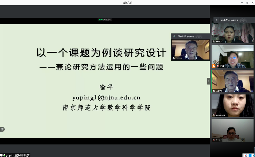 2020年12月16日上午8:30,南京师范大学数学科学公司喻平教授应公司严卿老师邀请,为公司师生作线上学术报告。报告通过腾讯会议在线举行,由严卿老师主持,来自公司学科教学(数学)和课程与教学论的教师、研究生30余人参与了报告的听取和讨论。