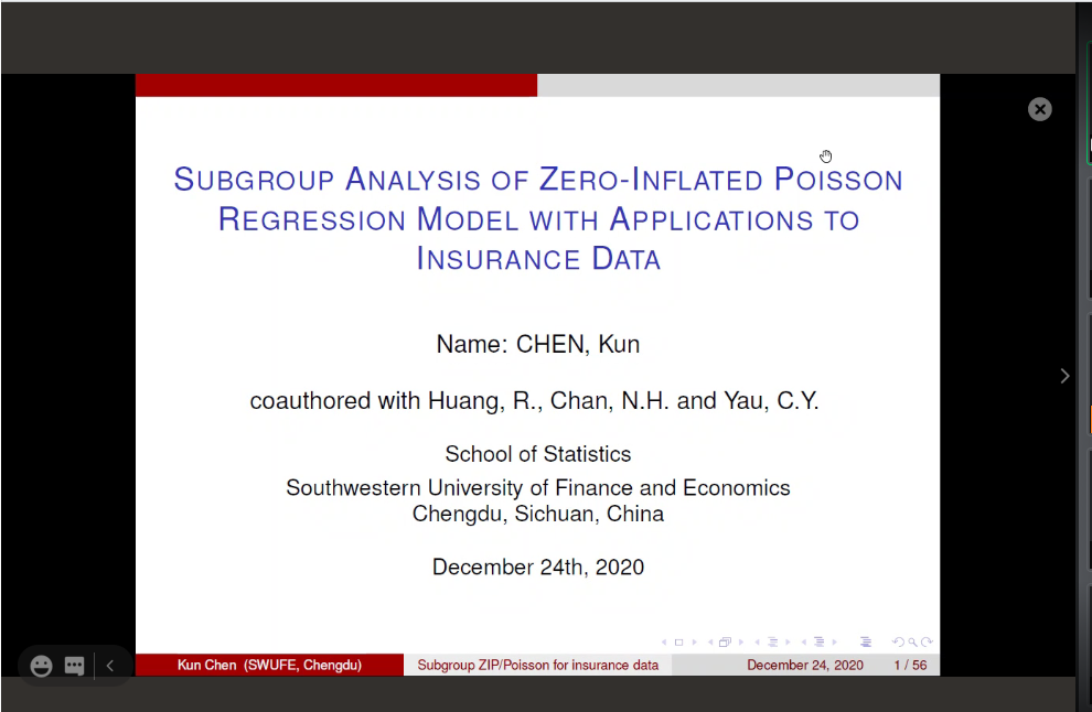 陈坤教授报告题目为《Subgroup Analysis of Zero-Inflated Poisson Regression Model with Applications to Insurance Data》,主要针对保险公司提供的个性化费率保险政策,需要从相应的异质索赔频率数据中识别出被保险人的子组。为了解决保险计数数据的聚类问题,提出两个新的模型,即子群零膨胀泊松(ZIP)模型和子群泊松模型,并使用一个惩罚函数来识别群体特定的截距和个体协变量的影响。此外,还开发了用于优化函数的ADMM算法,并证明了其收敛性。最后,通过模拟研究展示了令人满意的有限样本性能,并将该方法应用于汽车保险索赔数据之中,得到了较好的结果。