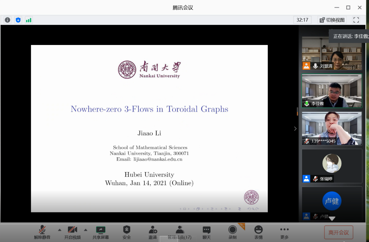 2021年1月14日下午,南开大学李佳傲老师和williamhill中文官网胡小兰副教授应公司刘慧清教授邀请,为公司师生作线上学术报告,报告通过腾讯会议在线举行。会议由刘慧清教授主持,来自运筹学与控制论专业的教师、博士和硕士研究生参与了报告的听取、讨论。