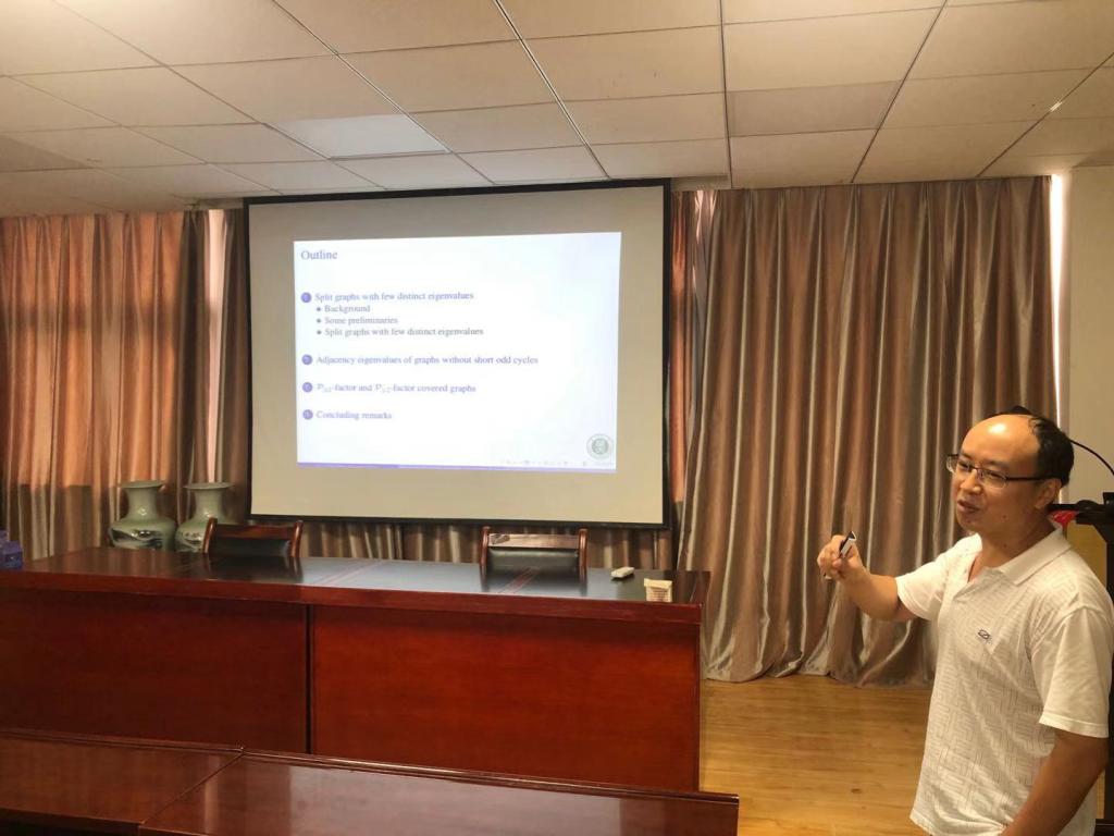 接下来,李书超教授介绍了图谱理论的相关内容,首先是利用组合设计的方法刻画了具有3个或者4个不同(规范)拉普拉斯特征值的分离图。然后介绍了利用图的谱条件来刻画图的因子覆盖问题。