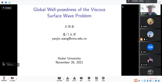 2021年11月26日下午,厦门大学王焰金教授应公司向妮教授邀请,为几何团队师生作了题为“Global Well-posedness of the Viscous Surface Wave Problem”的线上学术报告。
