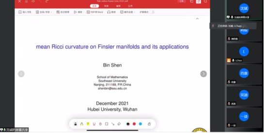 沈斌老师报告的题目为《mean Ricci curvature on Finsler manifolds and its applications》,在这次报告中,我们主要是研究平均Ricci 曲率和相关的Bochner 型不等式,我们找到了一些Finsler流形上的消没(vanishing)定理以及其他有关结果。