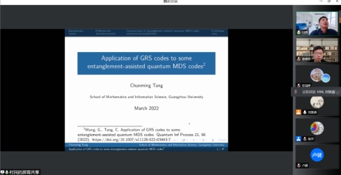 唐春明老师的报告题目是《Application of GRS codes to some entanglement-assisted quantum MDS codes》, 唐春明老师首先向大家介绍了报告相关的概念,接着就向大家报告了他们团队对于量子MDS码的构造方面的研究成果。
