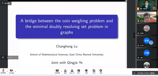 吕长虹老师的报告题目是《Abridge between the coin weighing problem and the minimal boubly resolving set problem in graphs》, 吕长虹老师首先向大家介绍了报告相关的概念以及研究背景,接着就向大家报告了他们团队对于硬币称重问题和图中极小二分辨集问题之间的一个桥梁的研究成果。