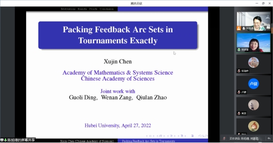 陈旭瑾老师的报告题目是《Packing Feedback Arc Sets in Tournaments Exactly》, 陈旭瑾老师首先向大家介绍了报告相关的概念,接着就向大家报告了他们团队对于竞赛图中的Packing反馈弧集的研究成果。