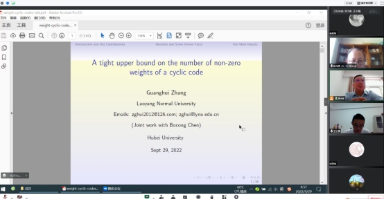 2022年9月29日上午,洛阳师范公司张光辉教授应邀为公司师生作了题为《Atight upper bound on the number of non-zero weights of a cyclic code》的学术报告。