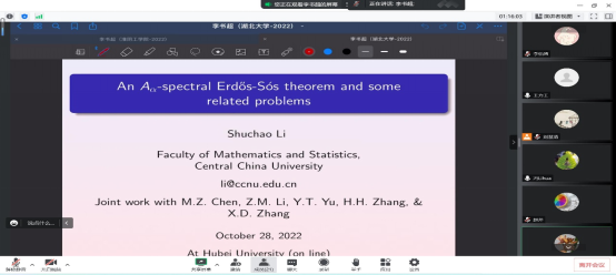 -spectral Erdos-Sos theorem and some related problems》, 李书超老师首先向大家介绍了报告相关的概念以及研究背景,接着就向大家报告了他们团队关于谱Erdos-Sos theorem的最新研究成果。李书超老师讲解生动形象,思维严谨,极大鼓舞了青年教师们学术热情,给大家了很多的启示。