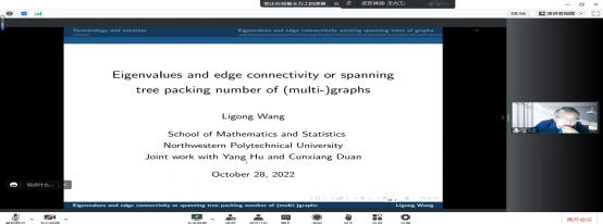 西北工业大学王力工教授的报告题目是《Eigenvalues and edge connectivity or spanning tree packing number of (multi-)graphs》。王力工老师首先向大家介绍了报告相关的概念以及研究背景,接着向大家报告了他们团队关于边连通度和边不交的支撑树与图的特征值之间关系的最新研究成果。王力工老师的讲解十分细致,生动丰富,深入浅出,使大家获益匪浅。