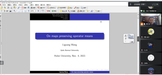 2022年11月4日上午,曲阜师范大学数学科学公司王利广教授为公司师生作了题为《On maps preserving operator means》的学术报告。