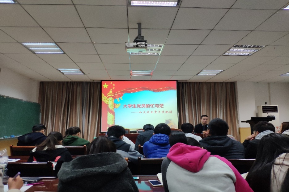 2018年11月7日晚七点,williamhill中文官网团委书记周杰于本院201为大家讲解主题为“老员工党员的忙与茫”的党课,本院的入党积极分子参与学习。