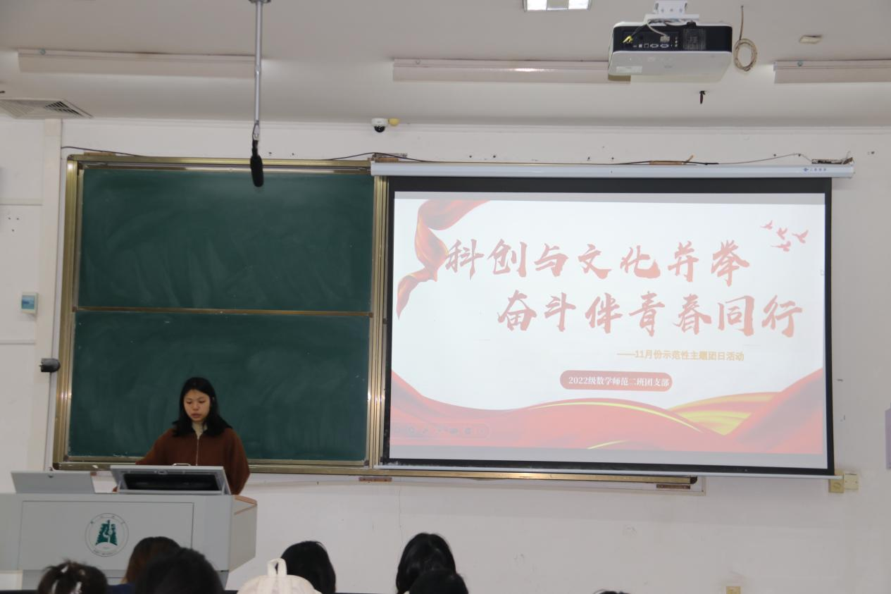(通讯员胡玉红刘越敏邓双媛)青年是国家的未来,是民族的希望,也是科技创新的生力军。11月20日,2022级数学师范二班团支部围绕“科创与文化并举,奋斗伴青春同行”开展11月主题团日活动,引领支部团员青年深学细悟强思想,实干笃行勇担当。