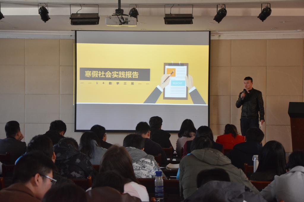 报告会以团支部为单位收集整理员工上交的社会实践报告,并由各团支部做总结报告。报告会由吕杰锴主持,他以风趣的语言介绍了此次寒假社会实践的主要内容。各团支部上交的社会实践报告内容主要有家乡变化,与父母谈心心得,公益活动以及回访母校等。各团支部报告风格迥然不同,15信科1班团支部由具演讲比赛经验的团支书喻程来做报告,她以激昂语调和绘声绘色的描述展现了15级信科1班团支部寒假社会实践报告的多样性,精心设计并制作了实践日历也为展示添色不少;14数学1班团支部精心制作的ppt让许多员工评委惊叹。