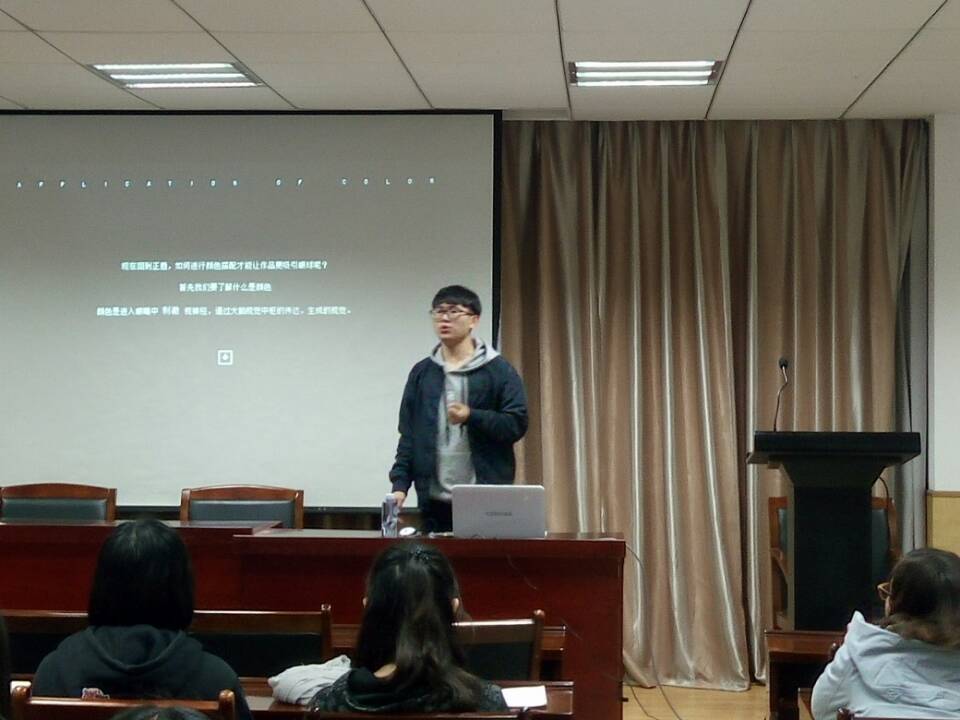 主讲人缴金锟幽默风趣的自我介绍,将严肃的现场气氛迅速升温,充满欢声笑语。本次培训以“窥色”为主题展开,由众人熟知的“滴滴打车”、“肯德基”等品牌,分析色彩对感官的冲击效果切入正题。实例理论相结合,分别从颜色特性、冷暖色分析、撞色提升、作品分析四个板块全面细化色彩在校园海报制作上的应用。