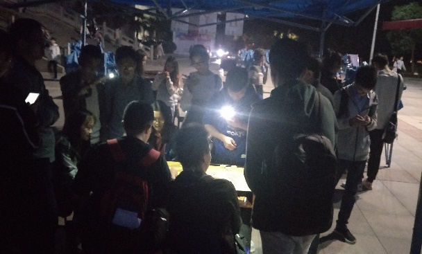 在临近结束时,即使周围天色已黑但丝毫不减五子棋比赛的激烈,同学们挑灯夜战,一决高下。
