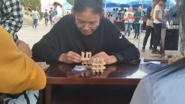趣味数学游戏包括数字华容道,趣味数独,花样魔方,孔明锁和五子棋等。同学们都积极的参与在活动中。某参赛者说:“游戏很烧脑,需要花很多时间来完成,但这样才更好玩,更刺激,而且游戏失败了还可以领取复活卡更加有竞争力。”镜头里他们认真玩游戏的样子展现了积极向上的精神风貌。