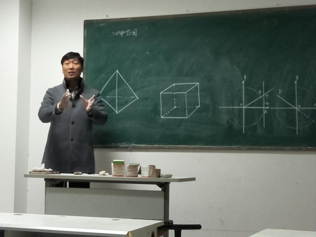 李老师强调,粉笔作图首先要做到心中有图。他先以画三角函数图像为例,指出作图时要控制好身体与黑板之间的距离,尽量自然舒展,灵活使用粉笔的边角进行翻转。随后他以高中教材祖暅原理画立体的圆柱和半球为例,教授了把虚线画直的诀窍。