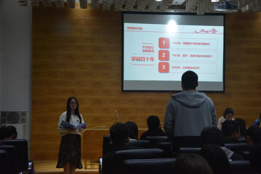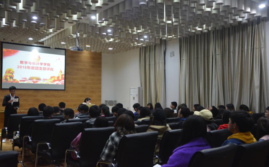此夜的艺术公司报告厅华灯璀璨,气氛庄严肃穆,厅内观众座无虚席。傍晚七时许,评优表彰大会在全场齐唱共青团团歌的嘹亮歌声中拉开了帷幕。接着,2016、2017级十三个团支部团支书及部分团支委依次上台进行汇报。展示过程中形式多样、风采各异:应用统计学1701团支部、信息与计算科学1701团支部播放了自制的精美视频,展示支部魅力;信息与计算科学1601团支部与观众积极互动,提出问题并让支部成员现场发表感想和意见。最后,经过工作人员严密公正地唱票,评选出了本次表彰大会的结果。