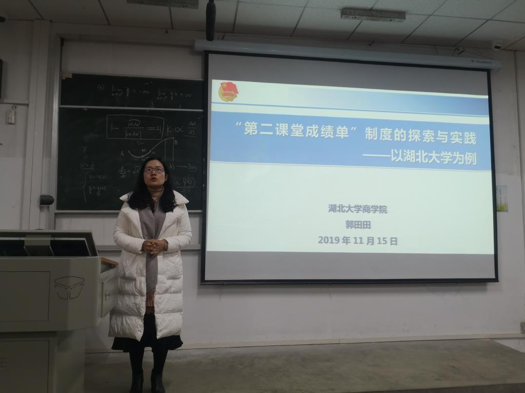 williamhill中文官网第四期团课学习于2019年11月27日下午18:00在教三302教室进行。本次由商公司郭田田老师为大家上课,主题为“第二课堂成绩单制度的探索与实践”。