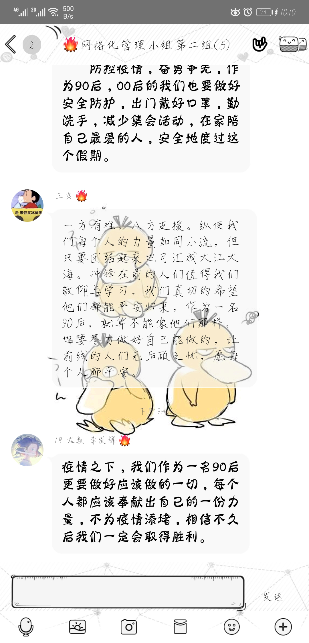 “We Are All Fighters!”数学1802班的班会喊出这样的口号。星星之火可以燎原,面对疫情我们每一个人都应该也都必须成为战士。我们不是一线的医护奋斗者,但是员工党员也有率先垂范为疫情防护做贡献,我们没有能力为病者带来安康,但是我们可以用实际行动听从安排减少恐慌。We Are All Fighters!每一个平凡人都有不平凡的一面。新青年的我们,理应向这些平民英雄学习,学习那些不屈,坚强和义无反顾,还有在他们身上闪闪发光的爱国精神!