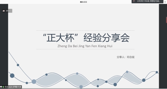 本次会议的主持人刘与进宣布会议开始后,首先由主持人刘与进为介绍了此次会议的主要目的。随后邓念斌就比赛经验开始进行分享,主要从前期准备、数据搜集、数据分析、对策建议这四个方面进行了介绍,并且为同学们指出了清晰的研究思路。之后柯琦也通过丰富的比赛经验告诉同学们,在选题上,一个良好的选题就是成功的一半,选题一定要贴近社会热点问题,具有可操作性。同时,在前期准备上,可以通过定量与定性相结合,以结果为导向来确定分析方法,同时数据搜集时应该注意:问卷的统计汇总阶段最容易出现问题,在这个过程应该尤其仔细认真。最后,调查得出的结论应该在行业内外进行对比,并且要具有创新思维和拓展思维。