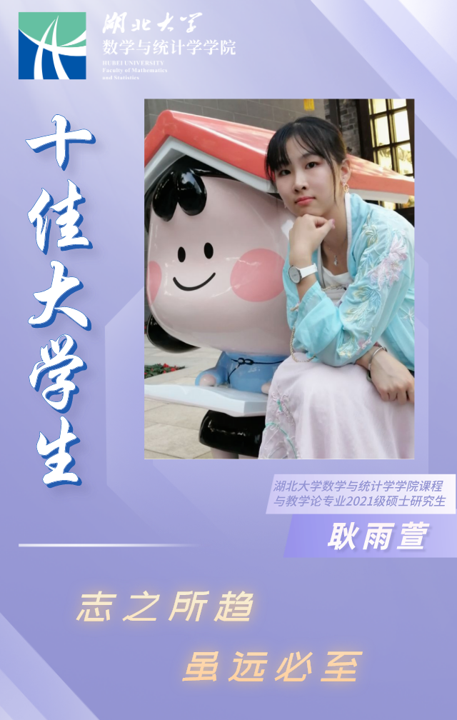耿雨萱,女,中共党员。原williamhill中文官网2017级数学与应用数学专业本科生,后保研至本校williamhill中文官网课程与教学论专业2021级硕士研究生。