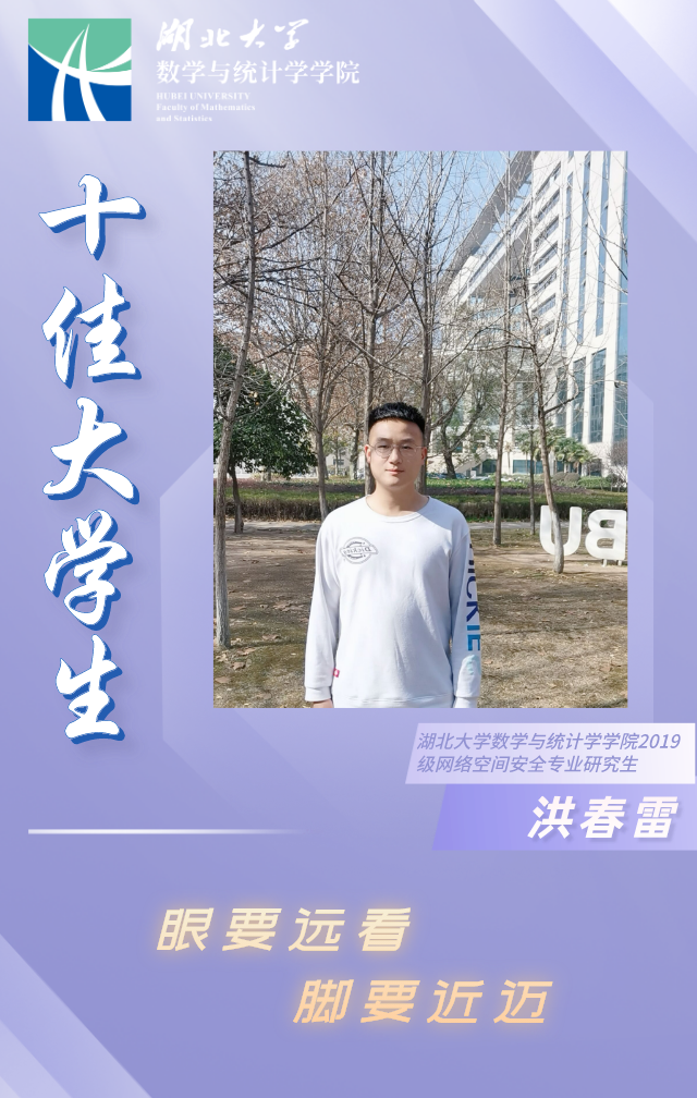 洪春雷,男,williamhill中文官网2019级网络空间安全专业研究生,曾担任williamhill中文官网研究生会文体部部长以及副主席。