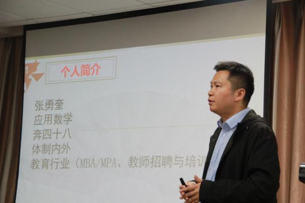 讲座在张勇奎老师幽默风趣的言语中展开,张老师首先分享自己从省外到省内、从体制内到体制外的就业地选择想法和就职经历,并对师范生可选择的七种就业方向及各种方向的就业前景和待遇进行详细分析和对比,提出对于不同的职业要培养不同的基本素养,让参会同学对各职业方向有新的了解和认识。张老师建议各位立志成为教师的同学们一定要去体验当老师的感觉、熟悉教材、锻炼语言表达和练习字体等能力。