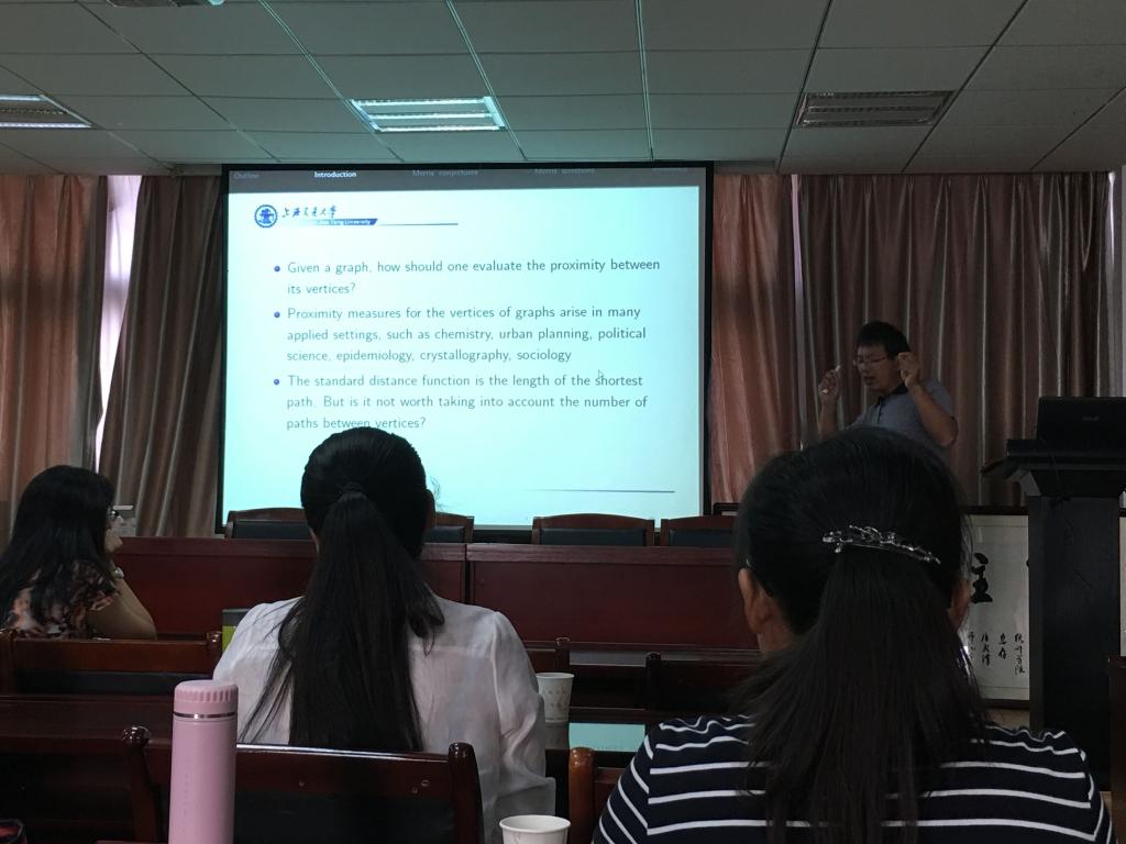 张晓东教授的报告题目为《Merris’Problem and Doubly Stochastic Graph Matrices》。报告中,他首先对拉普拉斯矩阵和关联矩阵进行了定义,其次对这篇文章中问题和猜想进行了具体地讲解,然后得出了一些重要的结论和新的问题。
