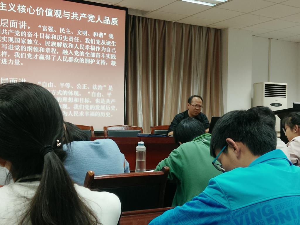 2018年10月31日,williamhill中文官网第六期入党积极分子培训班成员聚集在院201报告厅,进行第三次的党课学习。党委宣传部副部长陈红灿上了一堂以“核心价值观与共产党人品质”为主题的党课。