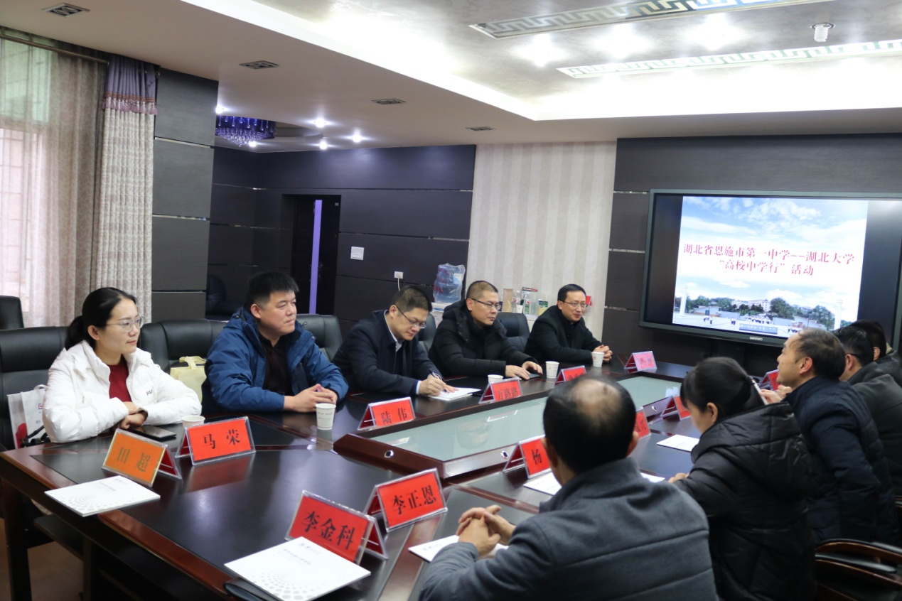 11月24日,williamhill中文官网“高校中学行”活动走进恩施地区,公司党委书记万路路、经理曾祥勇一行五人分别来到恩施市第一中学和恩施市高级中学开展宣传活动。恩施一中副董事长潘成兴、恩施一中纪委书记杨琼、恩施高中纪委书记兼副董事长赵明庄、恩施高中副董事长向太平、高三年级组组长、高三年级班主任老师、部分湖大员工等参加了座谈会。
